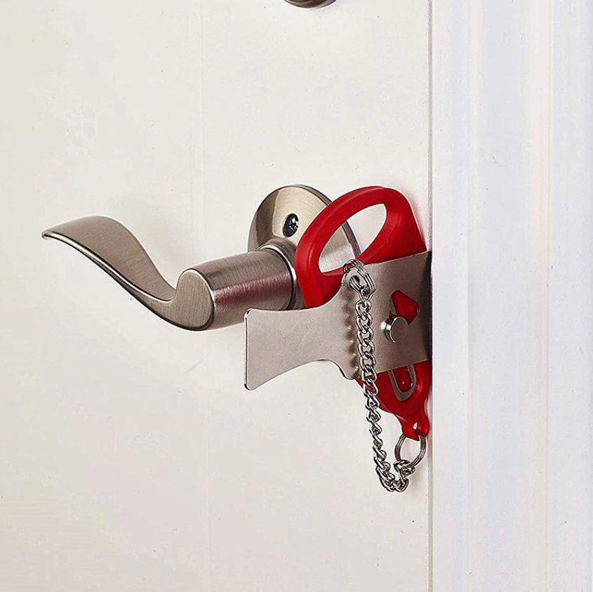 Anti-theft Portable Door Lock is a door lock that you can easily install and remove in seconds. It works on almost any door that opens inward. It installs onto any door within just seconds, and gives you the extra piece of mind you need. Even when the door has an existing lock on it, the portable door lock will give you the extra security in case the first lock breaks, gets picked, or someone has a key for it.